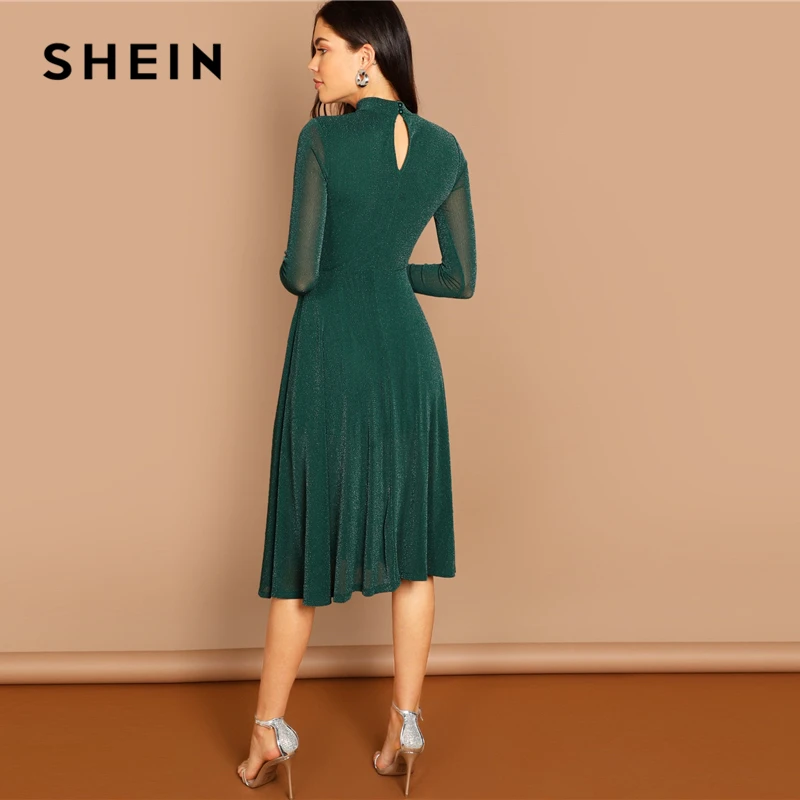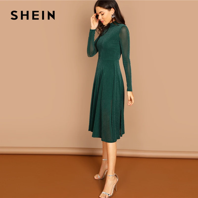 HIGH QUALITY SHEIN Green Party Solid Mock Neck Glitter Fit And Flare Stand Collar Long Sleeve Dress Autumn Women