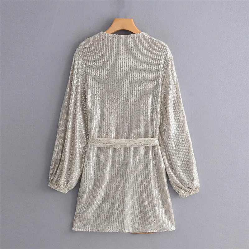 Aachoae Women Sequin Party Dress Deep V-neck Sexy Club Bodycon Dress Elegant Lantern Long Sleeve Mi