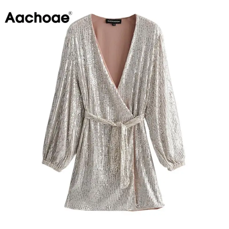 REVIEW TOP SELLER Aachoae Women Sequin Party Dress Deep V-neck Sexy Club Bodycon Dress Elegant Lantern Long Sleeve Mi