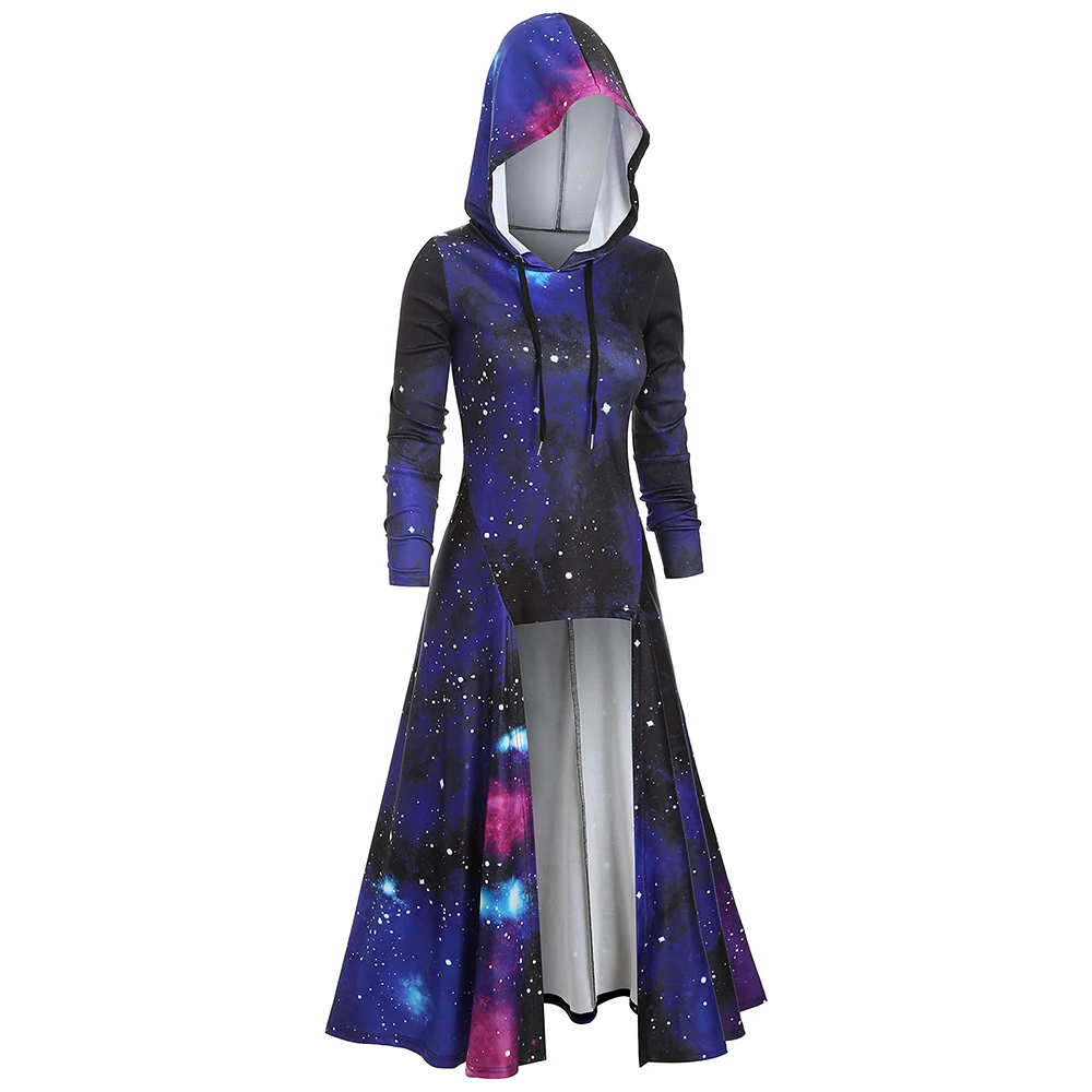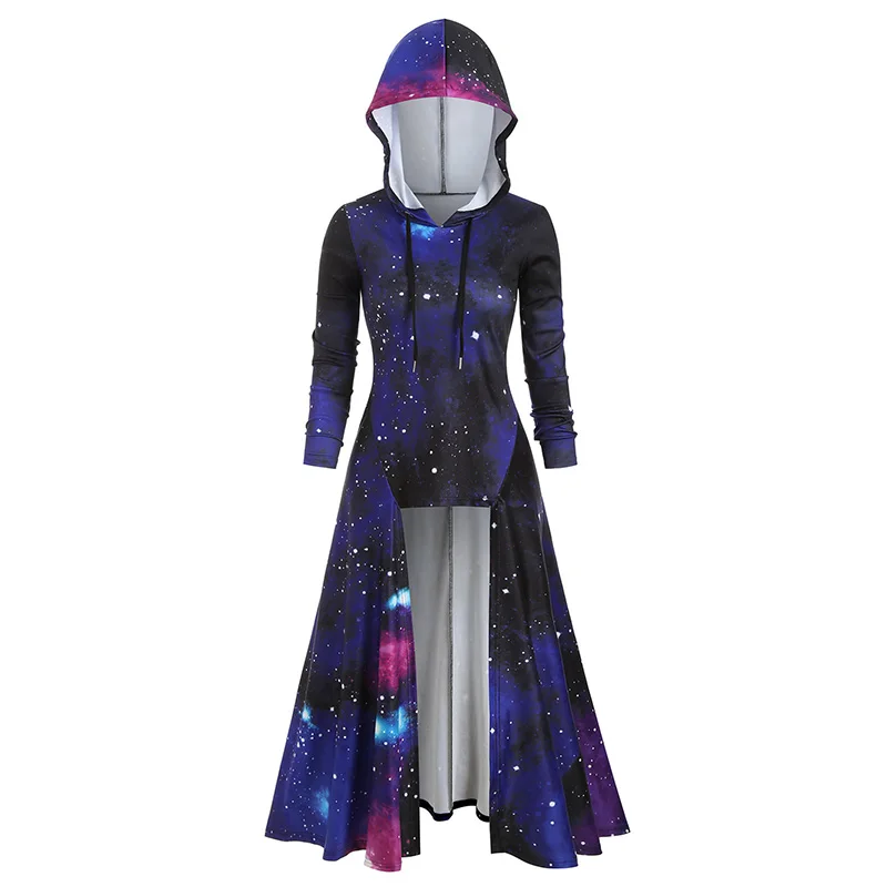 HIGH QUALITY ROSEGAL Hooded Galaxy Print High Slit Maxi Top Extra Long Casual Party Dresses 2019 Autumn Lace Up